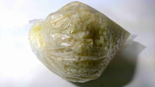 1.米飯前置作業:拿出一個透明塑膠袋,放入白飯和蛋液,用手輕輕搓揉塑膠袋(目的是使每粒米都裹上蛋液),靜置備用。